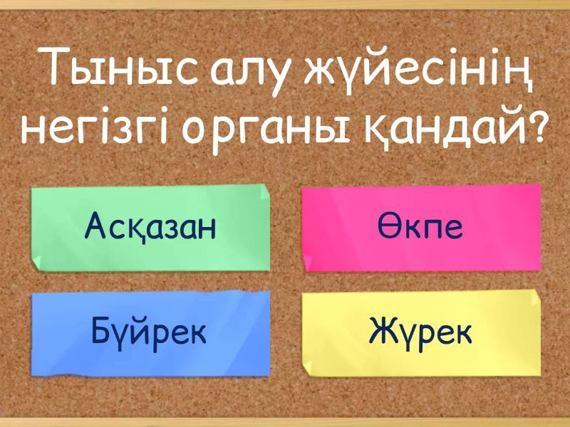 1) Тыныс алу жүйесінің негізгі органы қандай? a) Асқазан b) Өкпе c) Бүйрек d) Жүрек 2) Өкпенің негізгі қызметі қандай? a) Ас қорыту b) Газ алмасу c) Иммунитет d) Қан айналымы 3) Тыныс алу жолдарына не жатады? a) Бүйрек b) Бауыр c) Трахея d) Өт қабы 4) Тыныс алу процесі қайда басталады? a) Ауыз b) Кеңірдек c) Мұрын d) Өкпе 5) Көмірқышқыл газы қайда шығарылады? a) Асқазан b) Жүрек c) Өкпе d) Бауыр 6) Тыныс алу жүйесінің ауруы қандай? a) Гастрит b) Гипертония c) Диабет d) Астма 7) Тыныс алу жиілігі неге байланысты? a) Шаш түсі b) Тері түсі c) Жас d) Көз түсі 8) Тыныс алу жүйесінің негізгі қызметі қандай? a) Оттегі алу b) Ас қорыту c) Иммунитет d) Қан айналымы 9) Тыныс алу жүйесінің бөлігі емес? a) Өкпе b) Трахея c) Бауыр d) Кеңірдек 10) Тыныс алу жүйесінің ауруларының алдын алу үшін не істеу керек? a) Дұрыс тамақтану b) Көп ұйықтау c) Кітап оқу d) Теледидар көру