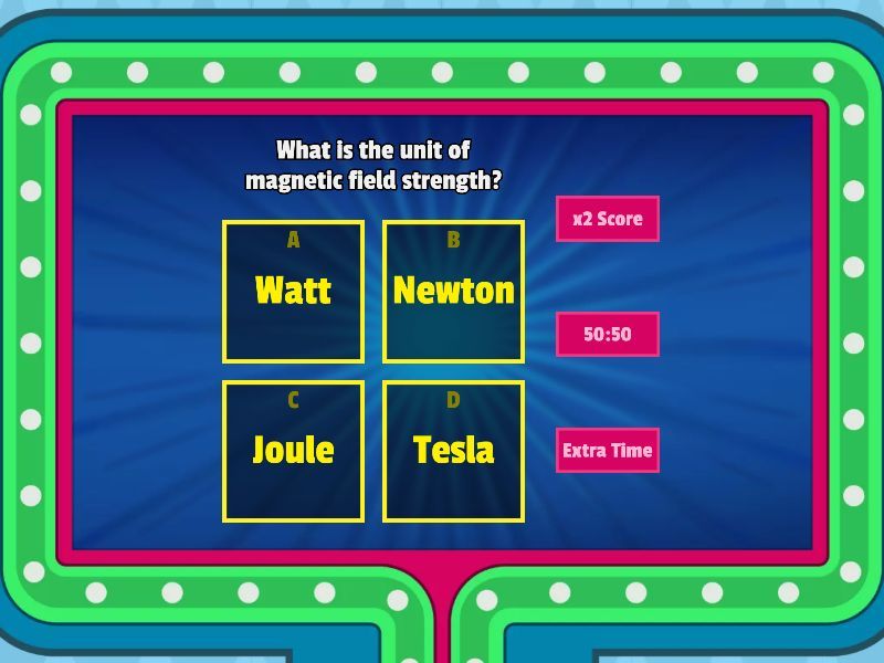 1) What is the unit of magnetic field strength? a) Watt b) Newton c) Joule d) Tesla 2) Which device converts electrical energy to mechanical energy? a) Motor b) Generator c) Transformer d) Battery 3) What is the direction of magnetic field lines outside a magnet? a) North to South b) South to North c) East to West d) West to East 4) Which rule determines the direction of force on a current-carrying conductor? a) Ohm's Law b) Right Hand Rule c) Ampere's Rule d) Fleming's Left Hand 5) What is the principle of an electric generator? a) Thermal Expansion b) Electromagnetic Induction c) Photoelectric Effect d) Chemical Reaction 6) What is the SI unit of electric current? a) Ohm b) Volt c) Ampere d) Coulomb 7) Which material is commonly used for electromagnets? a) Iron b) Copper c) Aluminum d) Plastic 8) What happens when a current-carrying conductor is placed in a magnetic field? a) Experiences Force b) No Effect c) Heats Up d) Melts 9) What is the function of a transformer? a) Store Energy b) Generate Current c) Change Voltage d) Convert Energy 10) Which law states that the induced EMF is proportional to the rate of change of magnetic flux? a) Ampere's Law b) Ohm's Law c) Lenz's Law d) Faraday's Law 11) What is the main component of a galvanometer? a) Coil b) Battery c) Resistor d) Capacitor 12) Which of these is a non-magnetic material? a) Iron b) Plastic c) Nickel d) Cobalt 13) What is the effect of increasing current in an electromagnet? a) Reverses Polarity b) Weaker Magnet c) No Change d) Stronger Magnet 14) What is the role of a commutator in a DC motor? a) Increase Voltage b) Reverse Current c) Store Energy d) Reduce Friction 15) What is the magnetic field inside a solenoid? a) Zero b) Non-uniform c) Uniform d) Variable 16) Which device measures electric current? a) Ammeter b) Voltmeter c) Galvanometer d) Ohmmeter 17) What is the effect of a magnetic field on a stationary charge? a) No Effect b) Moves Charge c) Heats Charge d) Charges Up 18) Which rule is used to find the direction of induced current? a) Fleming's Right Hand b) Left Hand Rule c) Ampere's Rule d) Ohm's Law 19) What is the effect of a magnetic field on a moving charge? a) Heats Charge b) No Effect c) Deflects Charge d) Charges Up 20) Which device converts mechanical energy to electrical energy? a) Battery b) Motor c) Transformer d) Generator