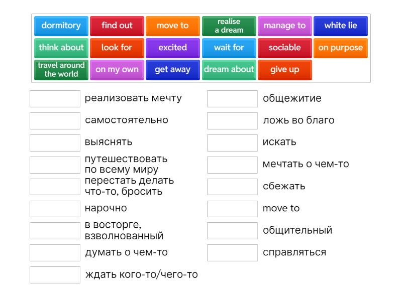 dormitory - общежитие, on purpose - нарочно, sociable - общительный, white lie - ложь во благо, look for - искать, dream about - мечтать о чем-то, travel around the world - путешествовать по всему миру, move to - move to, think about - думать о чем-то, wait for - ждать кого-то/чего-то, get away - сбежать, give up - перестать делать что-то, бросить, realise a dream - реализовать мечту, find out - выяснять, manage to - справляться, on my own - самостоятельно, excited - в восторге, взволнованный,