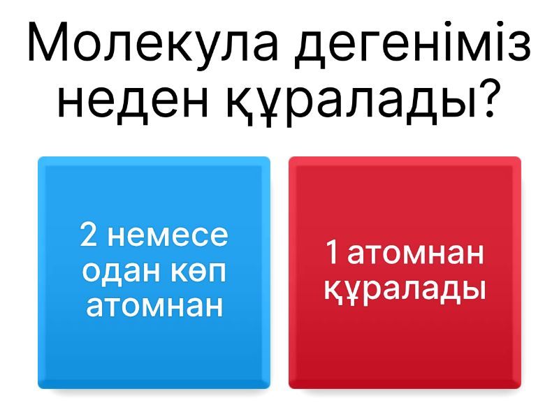 1) Молекула дегеніміз неден құралады? a) 2 немесе одан көп атомнан b) 1 атомнан құралады 2) Әлемдегі ең кішкентай зат a) атом b) молекула 3) Судың қайнау температурасы a) 50 b) 62 4) Ересек адамның денесі қанша пайыз су a) 66 b) 86 5) Мыстың қайнау температурасы қанша? a) 2750 b) 2567 6) Бір түрдегі атомдарды не деп атаймыз a) элемент b) зат 7) Біз тыныс алып жүрген ауа не деп аталады? a) оттек b) молекула 8) Темір химиялық атауы a) эс b) феррум 9) Оттегінің қайнау температурасы неше градусқа тең? a) -183 b) 183 10) Вискоза неден алынады? a) ағаштан b) мата