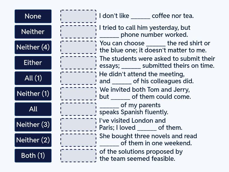 None - of the solutions proposed by the team seemed feasible., Both (1) - I’ve visited London and Paris; I loved ______ of them., Neither (1) - He didn’t attend the meeting, and ______ of his colleagues did., Either - You can choose ______ the red shirt or the blue one; it doesn’t matter to me., Neither (2) - ______ of my parents speaks Spanish fluently., All (1) - She bought three novels and read ______ of them in one weekend., Neither (3) - I tried to call him yesterday, but ______ phone number worked., Neither (4) - We invited both Tom and Jerry, but ______ of them could come., All - The students were asked to submit their essays; ______ submitted theirs on time., Neither - I don’t like ______ coffee nor tea.,