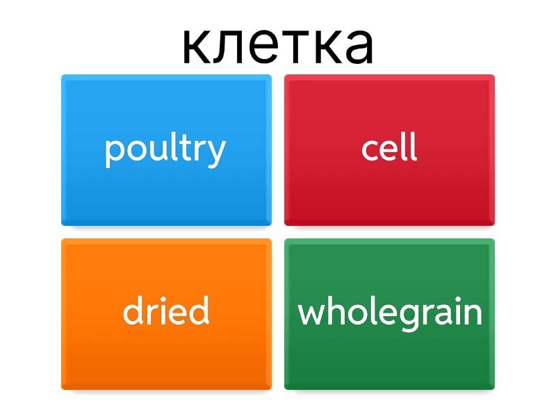 1) клетка a) poultry b) cell c) dried d) wholegrain 2) молочный a) dairy b) to prevent c) to heal d) fat 3) высушенный a) to heal b) protein c) dried d) cell 4) жир a) nutrient b) to heal c) fat d) poultry 5) замороженный a) dairy b) oxygen c) frozen d) wholegrain 6) исцелять, излечивать a) to heal b) oxygen c) dried d) poultry 7) железо a) dried b) to prevent c) iron d) poultry 8) питательное вещество a) oxygen b) to provide c) to heal d) nutrient 9) кислород a) oxygen b) frozen c) protein d) poultry 10) домашняя птица a) poultry b) iron c) to supply d) protein 11) предотвращать a) to prevent b) to heal c) dairy d) protein 12) белок a) to provide b) iron c) dried d) protein 13) предоставлять a) dried b) nutrient c) to provide d) to supply 14) поставлять a) to prevent b) to supply c) dairy d) to provide 15) цельнозерновой a) wholegrain b) poultry c) fat d) to supply