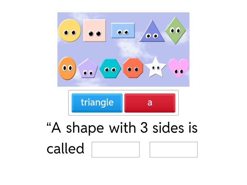 “A shape with 3 sides is called ____ ____ ____ ____ has no corners. ____ ____ has 4 equal sides. ____ ____ has 2 long sides and 2 short sides.