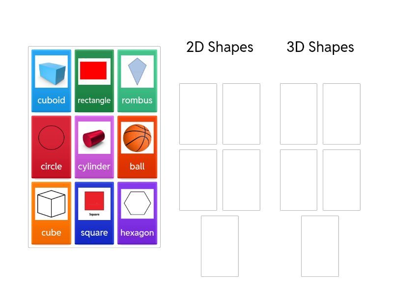2D Shapes: circle, rombus, hexagon, square, rectangle, 3D Shapes: cube, ball, cylinder, cuboid,