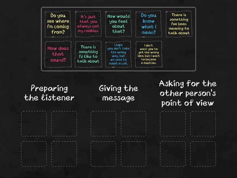 Preparing the listener: There is something I'd like to talk about, There is something I've been meaning to talk about, Giving the message: I hope you don't take the wrong way, but we need to adopt a cat., I don't want you to get the wrong idea, but I want to become a musician., It's just that you always eat my cookies. , Asking for the other person's point of view: Do you see where I'm coming from?, How does that sound?, How would you feel about that? , Do you know what I mean? ,