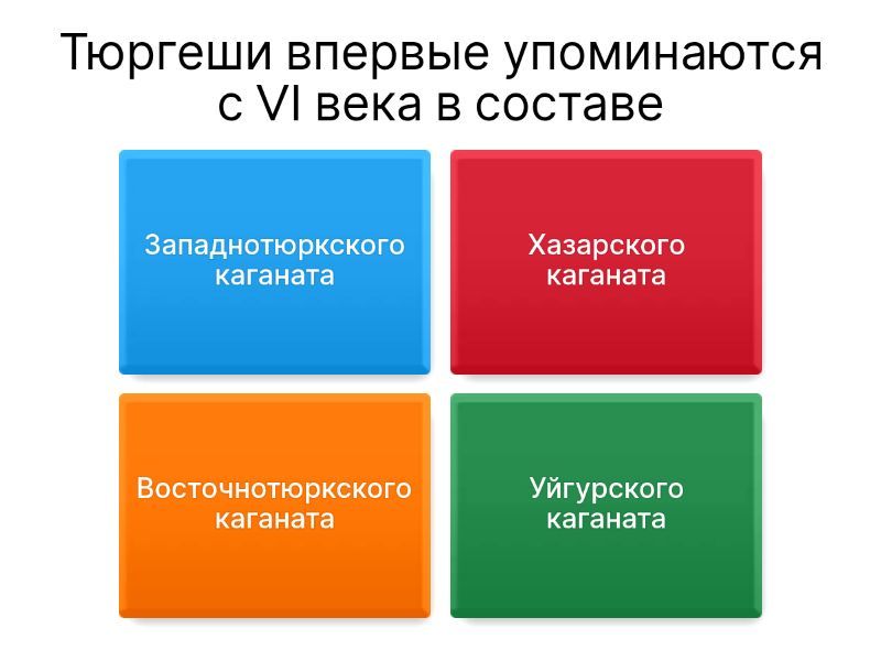 1) Тюргеши впервые упоминаются с VI века в составе a) Западнотюркского каганата b) Хазарского каганата c) Восточнотюркского каганата d) Уйгурского каганата 2) Основная территория расселения тюргешей — это междуречье a) Сырдарьи и Таласа b) Иртыша и Или c) Шу и Или d) Чу и Нарына 3) Родоначальником династии тюргешей был a) Сулу b) Учлик-каган c) Кутейба ибн-Муслим d) Бильге-каган 4) Главная ставка тюргешей при Учлике находилась в a) Таразе b) Кашгаре c) Отраре d) Суябе 5) Вторая ставка тюргешей размещалась в городе a) Кунгут b) Насабде c) Баласағұне d) Талгаре 6) Тюргеши делились на две ветви: a) сары-тюргешей и кара-тюргешей b) сары-кипчаков и кара-кипчаков c) огузов и карлуков d) белых и черных тюрок 7) Войска тюргешей состояли из a) 10 уделов b) 20 уделов c) 40 уделов d) 7 уделов 8) В 706 г. Учлик направил войска для помощи a) огузам b) карлукам c) согдам d) кипчакам 9) Арабской армией в Средней Азии командовал a) Халиф Муавия b) Сулук c) Ашина Шад d) Кутейба ибн-Муслим 10) Столицей тюргешей при Сулу стал a) Суяб b) Кунгут c) Отрар d) Тараз 11) Прозвище Сулу — Абу Музахим (Бодливый) — было дано ему за a) борьбу с Китаем b) смелые действия против арабов c) нападения на согдийцев d) дипломатические успехи 12) В 748 г. Китайская империя Тан разрушила город a) Тараз b) Испиджаб c) Кунгут d) Суяб 13) Атлахская битва произошла в a) 751 г. b) 744 г. c) 706 г. d) 870 г. 14) В Атлахской битве карлуки перешли на сторону a) китайцев b) тюргешей c) арабов d) уйгуров 15) Основная причина поражения китайской армии под Атлахом — a) нехватка продовольствия b) удар карлуков в тыл c) ослабление Танской династии d) превосходство арабов числом 16) Китай был окончательно изгнан из Жетысу после a) Таласского договора b) Атлахской битвы c) Восточнотюркского восстания d) появления огузов 17) Карлуки переселились в Жетысу в a) 746 г. b) 704 г. c) 751 г. d) 756 г. 18) Падение Тюргешского каганата произошло под натиском a) арабов b) уйгуров c) китайцев d) карлуков 19) Одной из причин падения Тюргешского каганата был конфликт между a) согдийцами и тюрками b) жалаирами и кипчаками c) жёлтыми и чёрными тюргешами d) карлуками и тюркешами 20) Основная причина переселения согдийцев в Жетысу — a) голод b) землетрясения c) религиозные преследования d) торговля и арабские завоевания