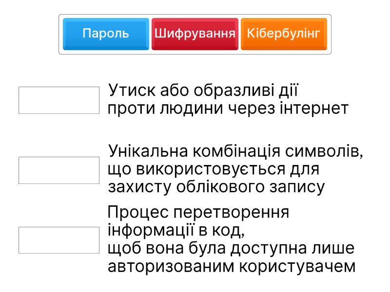 Пароль - Унікальна комбінація символів, що використовується для захисту облікового запису, Шифрування - Процес перетворення інформації в код, щоб вона була доступна лише авторизованим користувачем, Кібербулінг - Утиск або образливі дії проти людини через інтернет,