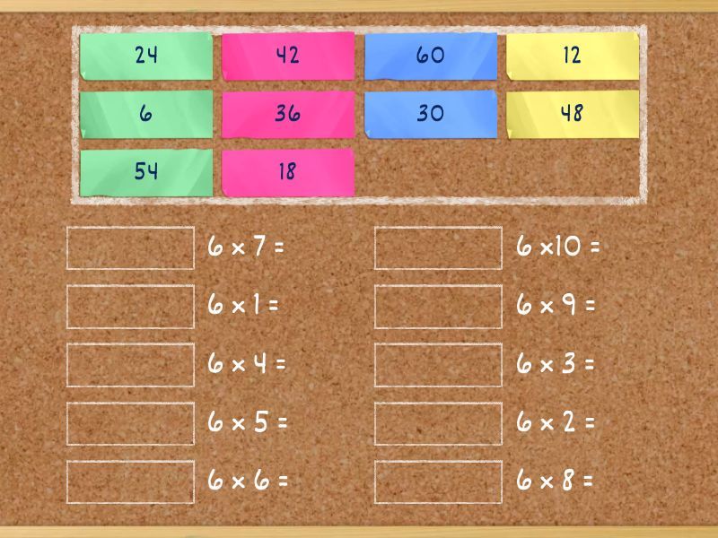 6 - 6 × 1 = , 12 - 6 × 2 = , 18 - 6 × 3 = , 24 - 6 × 4 = , 30 - 6 × 5 = , 36 - 6 × 6 = , 42 - 6 × 7 = , 48 - 6 × 8 = , 54 - 6 × 9 = , 60 - 6 ×10 = ,