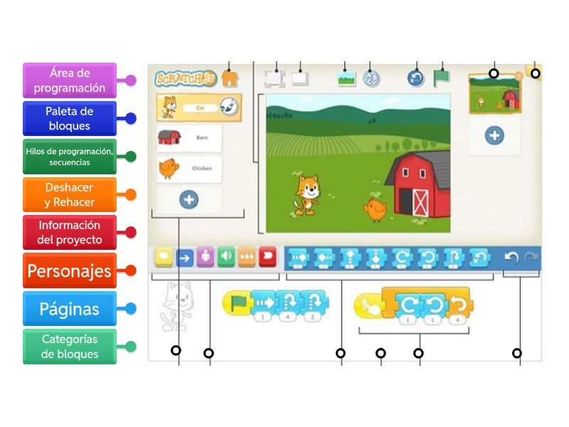 Páginas, Información del proyecto, Deshacer y Rehacer, Hilos de programación, secuencias, Área de programación, Paleta de bloques, Categorías de bloques, Personajes.
