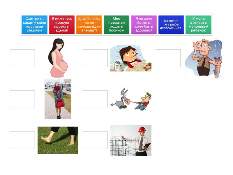 Чайник уже кипит, сними его с плиты, У меня в животе маленький ребёнок, Я повар, я готовлю вкусные блюда, Я инженер, я рисую проекты зданий, Здесь так жарко, хорошо что у меня есть веер, Я вижу зайца, хочу его поймать, Смотрите какая у меня красивая сумочка, Я не хочу болеть, хочу быть здоровой, Как вас постричь?, Я садовник, сейчас я поливаю шлангом огород, Мне нравится ходить босиком, Кажется эта рыба испорченная.., Мне тяжело ходить, но хорошо что у меня есть палка, Иди! Почему ты не хочешь идти вперёд?!,