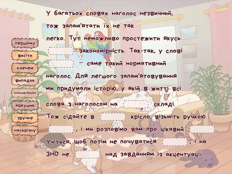 У багатьох словах наголос незвичний, тож запам'ятати їх не так легко. Тут неможливо простежити якусь ____ закономірність. Так-так, у слові ____ – саме такий нормативний наголос. Для легшого запам'ятовування ми придумали історію, у якій в житті всі слова з наголосом на ____ складі. Тож сідайте в ____ крісло, візьміть ручкою ____, і ми розповімо вам про цікавий ____. Учіться, щоб потім не почуватися ____, і на ЗНО не ____ над завданням із акцентуації. ____ одної вчительки вирішила ____ разом із ____ випити ____. П'ють вони лате або зовсім без цукру, або з ____ цукру, бо час від часу стають на ____ і, дивлячись на них, лякаються. Несолідно ж важити ____ у такому юному віці. ____ про це ____ долинув до ровесниць, які почали дивитися на них ____ поглядом ____, хоч і не ____. Деякі однокласники надумали навіть писати про них глузливі ____. Коли про це дізналася вчителька, то їй відвисла ____, адже ____ рішення про те, що вони питимуть лате без цукру, стало для неї не ____, а цілковитою ____.