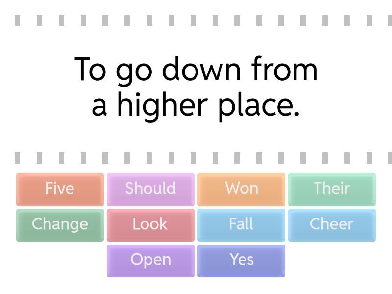 Fall - To go down from a higher place., Look - To use your eyes to see something., Won - When you do better than others in a game or race., Change - To make something different., Should - Used to say what is right or good to do., Yes - A word we say when we agree or want something., Their - Belongs to them., Five - The number 5., Open - Not closed; to move something so it is not shut., Cheer - To shout happily or clap for someone.,