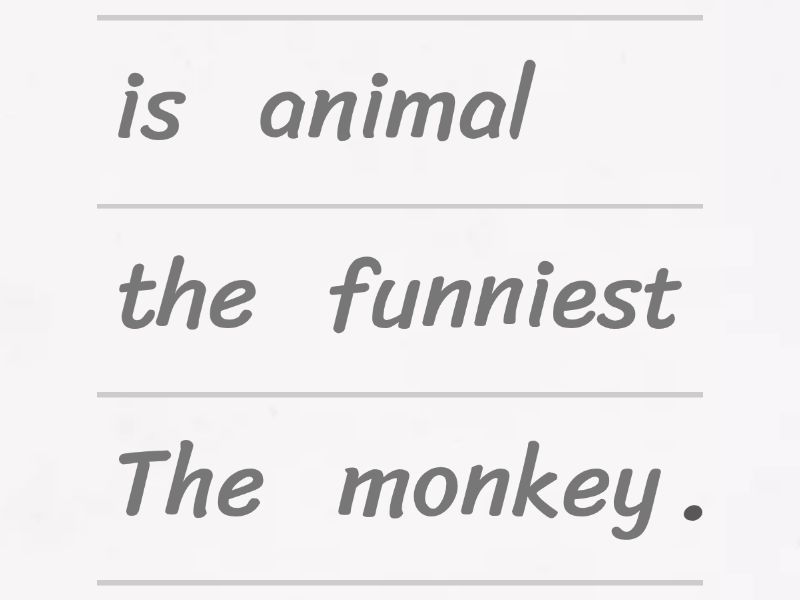 The monkey is the funniest animal., The puppy is smaller than the dog., The dogs are the friendliest pets., Winter is the coolest season., The crocodile is slower than the tiger., The giraffe is taller than the elephant., The snake is more dangerous than the rabbit., The cow is slower than the lion.,