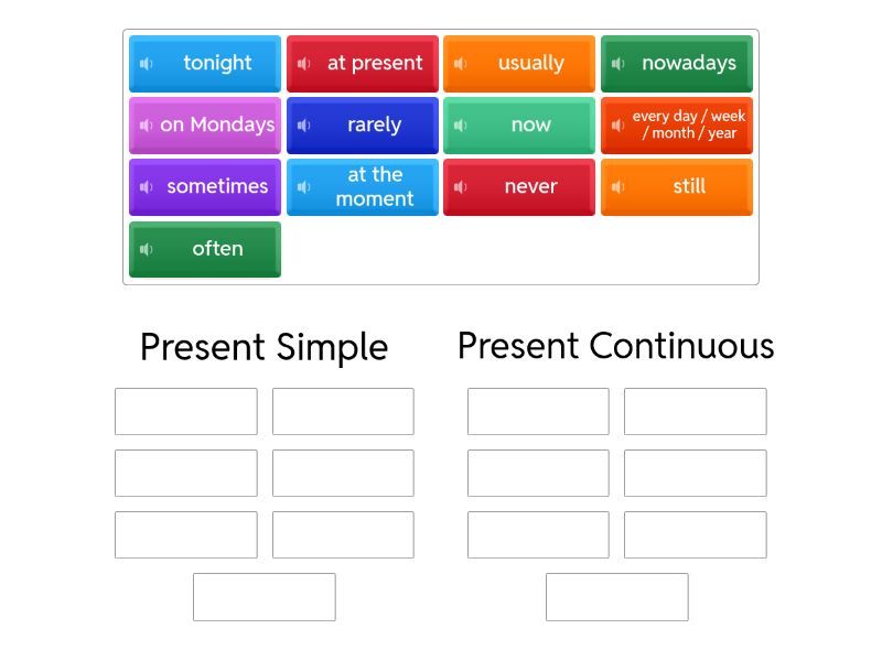 Present Simple: every day / week / month / year, usually, often, rarely, never, sometimes, on Mondays, Present Continuous: now, at the moment, at present, nowadays, tonight, still,