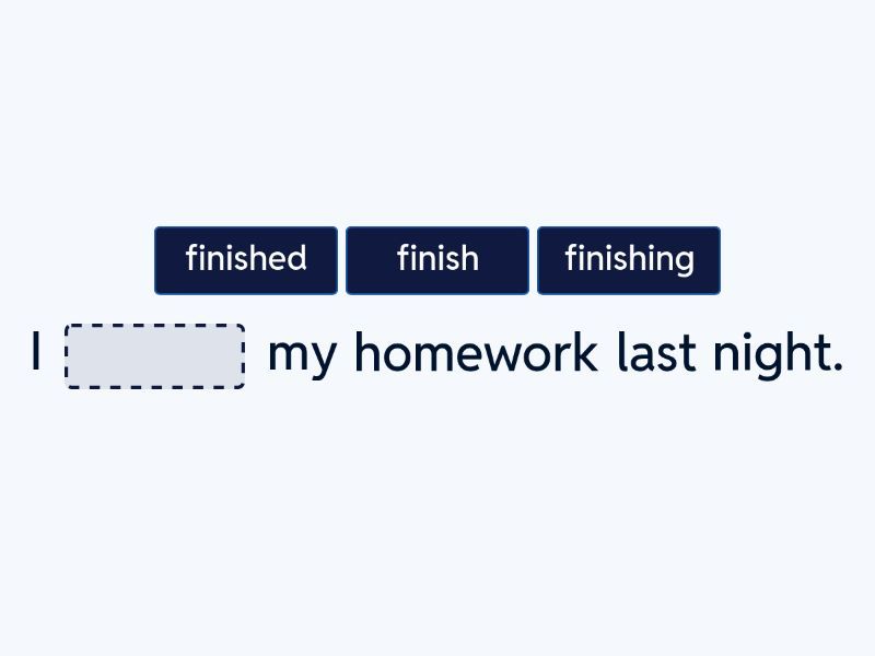 I ____ my homework last night. They ____ dinner at a new restaurant. I ____ early because I was tired. She ____ a new jacket last weekend. He ____ video games all afternoon. We ____ the house while the kids were outside. She ____ on the phone during the break. They ____ to school when they saw their teacher.