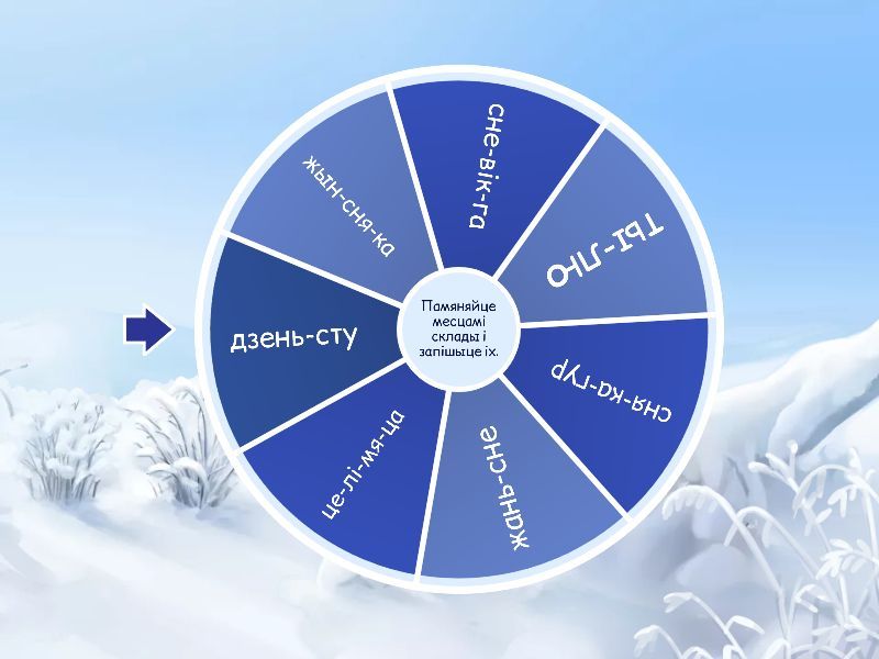 1) жын-сня-ка 2) сне-вік-га 3) ты-лю 4) сня-ка-гур 5) жань-сне 6) це-лі-мя-ца 7) дзень-сту