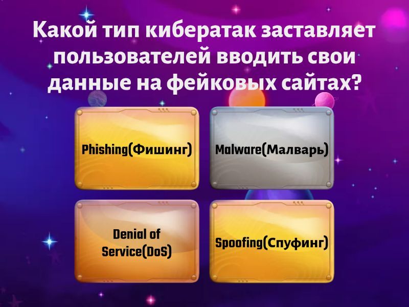 1) Какой тип кибератак заставляет пользователей вводить свои данные на фейковых сайтах? a) Phishing(Фишинг) b) Malware(Малварь) c) Denial of Service(DoS) d) Spoofing(Спуфинг) 2) Что такое пароль от восьми символов с использованием букв, цифр и символов? a) Сильный пароль b) Слабый пароль c) Средний пароль d) Необходимо еще оценить 3) Какой тип кибератак заставляет пользователя стать зараженной ссылкой и выполнять действия от его имени? a) Phishing(Фишинг) b) Malware(Малварь) c) Denial of Service(DoS) d) Spoofing(Спуфинг) 4) Для чего нужны программы-антивирусы? a) Защита от хакерских атак b) Защита от дос-атак c) Защита компьютерных систем от вирусов и других вредоносных программ d) Защита персональной информации 5) Какой тип кибератак направлен на перегрузку сервера и приостановку работы системы? a) Phishing(Фишинг) b) Malware(Малварь) c) Denial of Service(DoS) и DDoS d) Botnet(Ботнет) 6) Ради чего совершается большинство атак на ресурсы? a) Вирусное похищение данных b) Денежное мошенничество c) Общественно-политические причины d) Определение конкурентов 7) Какие данные могут храниться в информационных системах? a) Финансовые данные b) Медицинские данные c) Реквизиты для входа в банковский аккаунт d) Все вышеперечисленное 8) Что такое шифрование? a) Преобразование информации в нечитаемый вид b) Целостность и достоверность информации c) Выделение информации из контекста d) Загадка с картинками 9) Как называется форма административного регулирования кибербезопасности? a) Кибернизация b) Киберохрана c) Кибергигиена d) Кибернадзор 10) Что такое взлом? a) Когда программы и приложения скачиваются сами b) Когда пароль слишком длинный и его трудно запомнить c) Когда кто-то тайно получает доступ к чужому аккаунту или устройству без разрешения d) Когда интернет вдруг становится очень медленным 11) Как называется процесс связывания личности пользователя с учетной записью? a) Аутентификация b) Шифрование c) Хэширование d) Авторизация 12) Что такое Denial of Service (DoS)? a) Атака в которой происходит перегрузка данных b) Атака которая перезаписывает данные c) Атака запускает несколько процессов d) Атака перехватывает данные 13) Почему не следует открывать файлы от неизвестных источников? a) В файле может содержаться вирус или другое вредоносное ПО b) Файл может содержать слишком много информации c) Файл может содержать персональную информацию d) Файлы от неизвестных пользователей не имеют значения 14) Что такое VPN? a) Приложение для TikTok b) Технология, которая меняет IP-адрес (адрес в сети) c) Компьютерный вирус d) Пароль для Wi-Fi 15) Какой пароль самый надёжный? a) 123456 b) Имя собаки c) SoLnYShko2025!q d) Дата рождения 16) Что такое «двухфакторная аутентификация» (2FA)? a) Два пароля b) Пароль + код на телефон c) Два аккаунта d) Пароль + отпечаток пальца 17) Письмо с ссылкой: «Ты выиграл iPhone 17 pro Max 🎁! Переходи и забирай свой приз!🧧». Что делать? a) Перейти по ссылке b) Удалить или показать взрослым c) Ответить «Спасибо» d) Переслать всем друзьям 18) Где можно безопасно сохранять пароли? a) На стикере на мониторе b) В заметках в телефон, где нет пароля c) На стикере под чехлом телефона d) В менеджере паролей 19) Что делать, если увидел в группе фото одноклассника с обидной подписью? a) Лайкнуть b) Сделать скриншот и показать учителю/родителям c) Написать ещё обиднее d) Ничего 20) Можно ли использовать один и тот же пароль во всех играх и соцсетях? a) Да, удобно b) Только в играх c) Нет, если взломают один — взломают все d) Толь