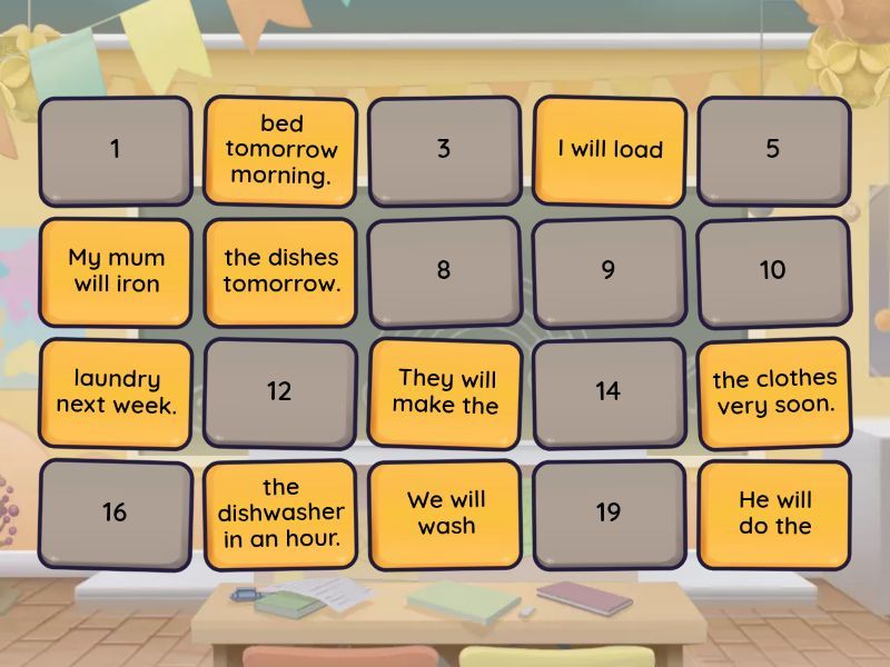 We will wash - the dishes tomorrow., I will load - the dishwasher in an hour., He will do the - laundry next week., My mum will iron - the clothes very soon., They will make the - bed tomorrow morning., Steve will vacuum the - floor in two hours., She will sweep the floor - very soon., My granny will - mop the floor next Saturday., They will dust - the furniture very soon., Tom will take the - rubbish out tomorrow morning.,