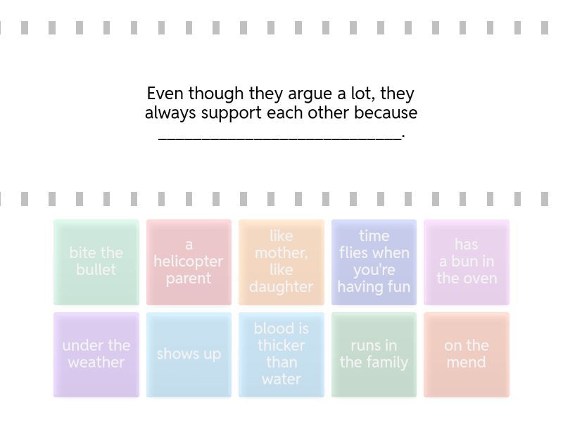 blood is thicker than water - Even though they argue a lot, they always support each other because ____________________________., a helicopter parent - My sister calls me a _______________________ because I check my son's homework three times a night., like mother, like daughter - She loves baking just like her mom—______________________________., runs in the family - They’re all amazing singers; talent really ________________________., has a bun in the oven - Guess what? My cousin just told us she ________________________!, time flies when you're having fun - We were playing games for hours, but it felt like minutes—____________________________!, bite the bullet - I hate cleaning the garage, but it’s time to __________________________ and do it., on the mend - After a week of rest, he’s finally ____________________________., under the weather - She’s feeling __________________________ today, so she stayed home from work., shows up - He always _____________________ late to meetings, and it's driving everyone crazy.,