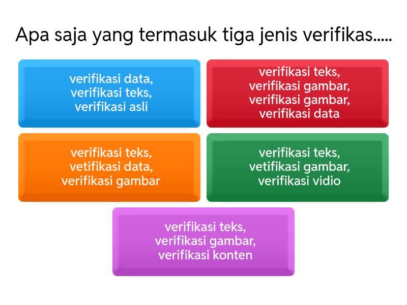 1) Apa saja yang termasuk tiga jenis verifikas..... a) verifikasi data, verifikasi teks, verifikasi asli b) verifikasi teks, verifikasi gambar, verifikasi gambar, verifikasi data c) verifikasi teks, vetifikasi data, verifikasi gambar d) verifikasi teks, vetifikasi gambar, verifikasi vidio e) verifikasi teks, verifikasi gambar, verifikasi konten 2) Langkah ke-3 dalam verifikasi teks adalah a) Masuk ke akun kantor atau sekolah lalu masuk ke akun saya b) Ketik kode yang akan dikirimkan melalui pesan teks ke perangkat seluler kalian, lalu pilih berikut c) Dihalaman telepon ketikan nomor telepon untuk perengkat seluler kalian, pilih mengirimi saya kode, lalu pilih berikutnya d) Pada halaman tambahkan metode, pilih telepon dari daftar lalu pilih tambahkan e) Pilih info keamanan dari panes navigasi kiri atau tautan dalam blok informasi keamanan, lalu pilih tambahkan metode dari halaman info keamanan 3) Verifikasi teks dilakukan ketika user akan melakukan.....Verifikasi teks dilakukan ketika user akan melakukan.....Verifikasi teks dilakukan ketika user akan melakukan..... a) Mereset kata sandi b) Masuk pada halaman baru c) Masuk ke akun google atau akun lainnya d) Saat meretas akun orang lain e) Saat ingin masuk ke akun platform lainnya 4) Ada berapa prinsip dasar verifikasi gambar.... a) 1 b) 3 c) 2 d) 4 e) 6 5) Cara paling efektif untuk menetapkan fotografer yang mendokumentasi adalah.... a) Memuji fotografer bahwa hasilnya sangat bagus dan jernih b) Memesan fotografer yang profesional dan terlatih dengan baik c) Menggunakan kamera sendiri lalu meminta di fotokan oleh pihak lain d) Menjadi fotografer sendiri e) Menghubungi yang memotret gambar tersebut, lalu menanyakan kebenarannya 6) Apa yang harus di konfirmasikan dalam prinsip dasar verifikasi gambar ( prinsip ke-2) ? a) Fotografer, prinsip, dan tempat b) Lokasi, tanggal, dan perkiraan waktu c) Lokasi, tempat, dan fotografer d) Lokasi, tanggal, dan fotografer e) Tanggal, fotografer, izin penulis 7) Apa saja yang menjadi penyebab utama ledakan liputan berita? a) Media sosial dan media berita b) Akses internet yang luas dan media sosial c) Jaringan internet dan berita d) jaringan internet dan iklan e) Media masa dan media sosial 8) Ada berapa langkah dalam verifikasi teks dan verifikasi video a) 5 dan 7 b) 5 dan 9 c) 5 dan 8 d) 4 dan 8 e) 6 dan 7 9) Dampak dari verifikasi video yang didukung dari masyarakat adalah.... a) Banyak vidio yang diunggah setiap detik b) Banyak video yang diunggah setiap detik dan menit c) Banyak video yang diunggah setiap jam d) Banyak video yang diunggah setiap menit e) Banyak video yang diunggah setiap detik/menit/jam 10) Berikan jawaban yang paling tepat tentang alasan mengapa verifikasi sangat perlu digunakan? a) Mempercepat data penipuan b) Menganjurkan keaslian konten c) Mengevaluasi peretasan d) Mengevaluasi Kebenaran konten e) Menilain keaslian akun