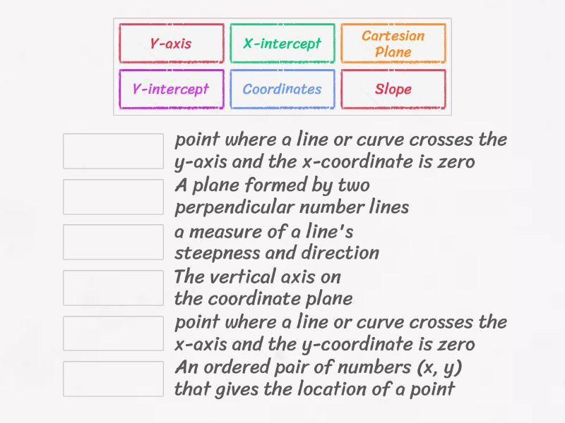 Slope - a measure of a line's steepness and direction, Coordinates - An ordered pair of numbers (x, y) that gives the location of a point, X-axis - The horizontal axis on the coordinate plane, Cartesian Plane - A plane formed by two perpendicular number lines, Y-axis - The vertical axis on the coordinate plane, X-intercept - point where a line or curve crosses the x-axis and the y-coordinate is zero, Y-intercept - point where a line or curve crosses the y-axis and the x-coordinate is zero, Midpoint - coordinates at which a line is divided into two equal halves., Distance - length between two points, Origin - The point where the x-axis and y-axis intersect, with coordinates (0,0), y = mx + c - straight line equation,