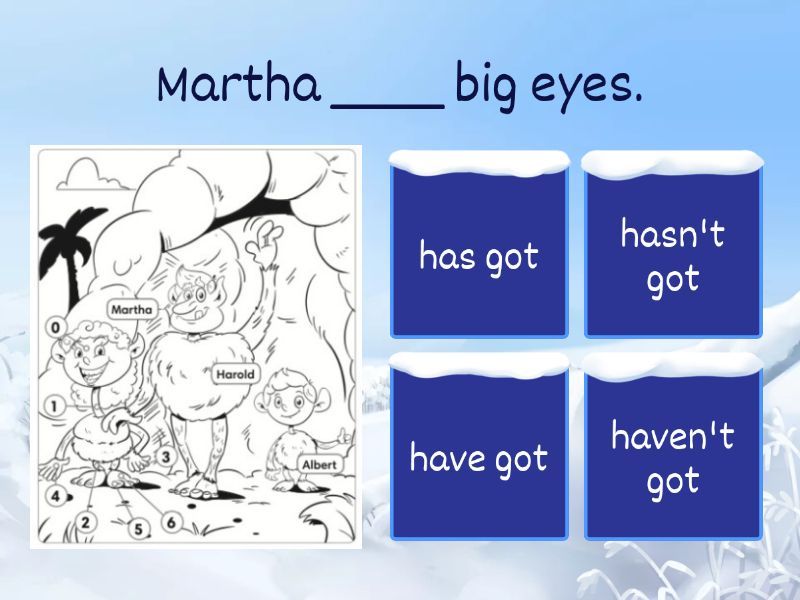 1) Martha ____ big eyes. a) has got b) hasn't got c) have got d) haven't got 2) Albert and Martha ____ long legs. a) haven't got b) has got c) have got d) hasn't got 3) Albert ____ spiky hair. a) have got b) has got c) hasn't got d) haven't got 4) Martha ____ long curly hair. a) hasn't got b) haven't got c) have got d) has got 5) Harold and Albert _____ blond hair. a) has got b) have got c) hasn't got d) haven't got