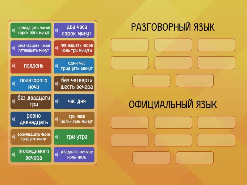 РАЗГОВОРНЫЙ ЯЗЫК: без четверти шесть вечера, полночь, полвторого ночи, без двадцати три, четверть пятого вечера, полседьмого вечера, полдень, три утра, ОФИЦИАЛЬНЫЙ ЯЗЫК: семнадцать часов сорок пять минут, один час тридцать минут, два часа сорок минут, шестнадцать часов пятнадцать минут, восемнадцать часов тридцать минут, двенадцать часов ровно, двадцать четыре часа ровно, три часа ровно,