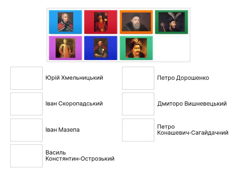 Дмиторо Вишневецький, Василь Констянтин-Острозький, Петро Конашевич-Сагайдачний, Петро Могила, Богдан Хмельницький, Іван Богун, Юрій Хмельницький, Петро Дорошенко, Іван Мазепа, Пилип Орлик, Іван Скоропадський, Кирило Розумовський, Григорій Сковорода,