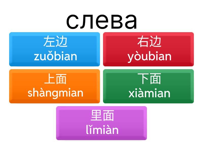 1) слева a) 左边 zuǒbian b) 右边 yòubian c) 上面 shàngmian d) 下面 xiàmian e) 里面 lǐmiàn 2) внизу a) 左边 zuǒbian b) 右边 yòubian c) 上面 shàngmian d) 下面 xiàmian e) 里面 lǐmiàn 3) внутри a) 左边 zuǒbian b) 右边 yòubian c) 上面 shàngmian d) 下面 xiàmian e) 里面 lǐmiàn 4) справа a) 左边 zuǒbian b) 右边 yòubian c) 上面 shàngmian d) 下面 xiàmian e) 里面 lǐmiàn 5) выше a) 左边 zuǒbian b) 右边 yòubian c) 上面 shàngmian d) 下面 xiàmian e) 里面 lǐmiàn
