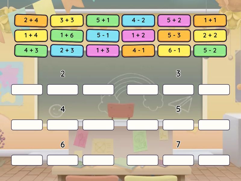 2: 1 + 1, 5 - 3, 4 - 2, 3: 5 - 2, 4 - 1, 1 + 2, 4: 5 - 1, 1 + 3, 2 + 2, 5: 1 + 4, 2 + 3, 6 - 1, 6: 3 + 3, 2 + 4, 5 + 1, 7: 4 + 3, 5 + 2, 1 + 6,