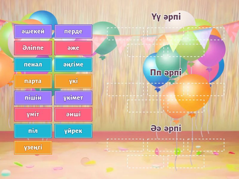 Үү әрпі: үйрек, үкімет, үкі, үзеңгі, үміт, Пп әрпі: піл, парта, перде, пішін, пенал, Әә әрпі: әже, әшекей, әнші, Әліппе, әңгіме,