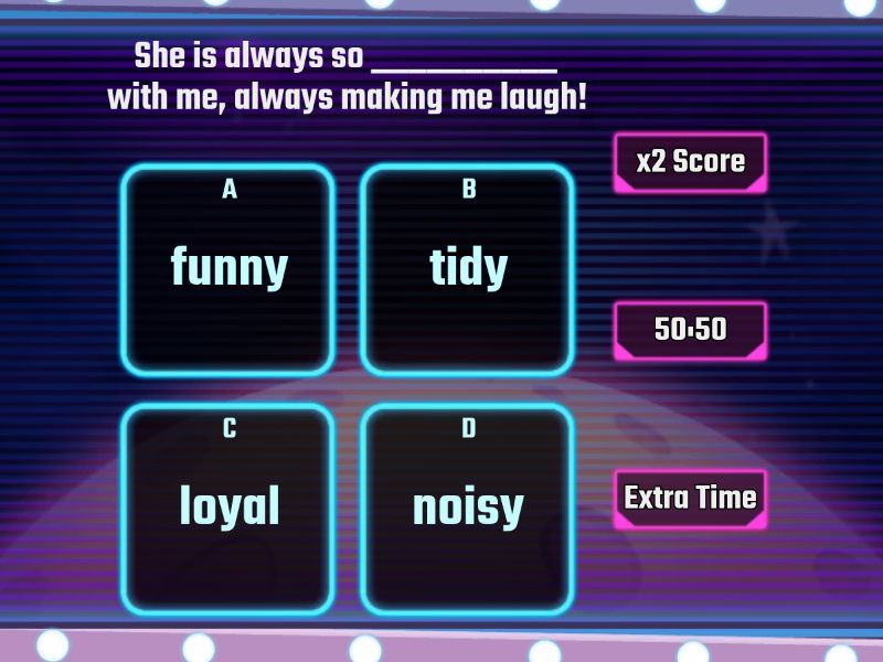1) She is always so __________ with me, always making me laugh! a) funny b) tidy c) loyal d) noisy 2) He is my __________; we share everything, and I trust him a lot. a) funny b) close friend c) generous d) shy 3) My __________ always gives great advice and supports me. a) reliable b) energetic c) bossy d) grandparent 4) It’s easy to __________ with my brother. We never argue and always support each other. a) teammate b) serious c) sincere d) get on well 5) She is very __________; she helps me every time I need assistance. a) helpful b) take after c) look up to d) stay in touch with 6) He is __________, he doesn't get upset easily, and always stays calm. a) sincere b) easy-going c) reliable d) patient 7) I always __________ my mother, I look like her in many ways. a) take after b) moody c) reliable d) trustworthy 8) Our manager is a little __________; he likes to tell everyone what to do. a) bossy b) adventurous c) easy-going d) generous 9) I want to __________ my friend after school, we haven’t spoken in a while. a) easy-going b) stay in touch with c) loyal d) tidy 10) They are so __________, they give their time and money to help others. a) Although b) informative c) noisy d) generous 11) He is very __________; he always generates new ideas. a) sincere b) bossy c) patient d) creative 12) You can always count on her; she is very __________. a) energetic b) reliable c) easy-going d) patient 13) The situation at work became more __________ when the boss left early. a) teammate b) easy-going c) bossy d) serious 14) I like spending time with my __________ because they are fun and energetic. a) serious b) generous c) generous d) teammates 15) She's __________ to everyone, always helps those around her. a) creative b) positive c) kind d) independent 16) He’s a __________ guy who gets upset very quickly and unexpectedly. a) moody b) grumpy c) informative d) sincere 17) I find her __________; she doesn't talk much and often seems unhappy. a) easy-going b) shy c) rude d) noisy 18) I __________ my friend and always make time to chat with him. a) grandparent b) look up to c) positive d) grumpy 19) The place was __________, the market was buzzing with people. a) outgoing b) independent c) noisy d) creative 20) My __________ friend is so empathic, she’s always nearby for support. a) easy-going b) bossy c) stay in touch with d) loyal 21) It’s hard to be __________ someone when they lie all the time. a) adventurous b) noisy c) reliable d) trustworthy 22) I love to be __________ and visit new places around the world. a) moody b) reliable c) adventurous d) easy-going 23) He likes to be __________ with his classmates; he always makes jokes. a) informative b) get on well with c) outgoing d) close friend 24) Don’t be sad, __________ and enjoy the moment! a) cheer up b) optimistic c) grandparent d) energetic 25) I try to be __________, even if things don’t go well. a) reliable b) easy-going c) sincere d) optimistic 26) She is a __________ person; she can’t stand being in a good mood for too long. a) reliable b) grumpy c) creative d) energetic 27) The movie was so __________, I couldn’t stop laughing. a) funny b) generous c) grumpy d) look up to 28) She likes to be __________; she likes to handle things on her own. a) sincere b) independent c) get on well with d) tidy 29) His __________ personality makes him fun to be around. a) energetic b) grumpy c) rude d) patient 30) The teacher was very __________, explaining things carefully and patiently. a) shy b) adventurous c) take after d) patient 31) I need a __________ friend who will always support me no matter what. a) get on well with b) noisy c) reliable d) sincere 32) The news was quite __________, everyone knew what was happening yesterday. a) informative b) serious c) tidy d) close friend 33) Her __________ nature makes her great to work with. a) easy-going b) sincere c) look up to d) shy 34) She is a very __________ person, always following through on promises. a) reliable b) loyal c) easy-going d) take after 35) It’s important to be __________ when dealing with stressful situations. a) patient b) serious c) bossy d) helpful 36) She’s __________ enough to give everything she has to others. a) easy-going b) grandparent c) generous d) bossy 37) He wasn’t being __________, just stating his opinion very directly. a) rude b) adventurous c) noisy d) kind 38) The room looked very __________ after she cleaned everything up. a) grumpy b) tidy c) easy-going d) funny