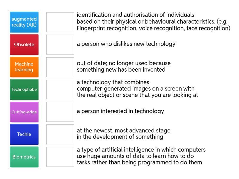 Technophobe - a person who dislikes new technology, Techie - a person interested in technology, E-commerce - buying and selling of goods over the internet, Breakthrough - important discovery or development, Indispensable - too important to be without, Revolutionary - involving a great or complete change, Obsolete - out of date; no longer used because something new has been invented, a game changer - a person, an idea or an event that completely changes the way a situation develops, Cutting-edge - at the newest, most advanced stage in the development of something, Labour-saving - designed to reduce the amount of work or effort needed to do something, Machine learning - a type of artificial intelligence in which computers use huge amounts of data to learn how to do tasks rather than being programmed to do them, augmented reality (AR) - a technology that combines computer-generated images on a screen with the real object or scene that you are looking at, Biometrics - identification and authorisation of individuals based on their physical or behavioural characteristics. (e.g. Fingerprint recognition, voice recognition, face recognition), to cost an arm and a leg - to be very expensive ,