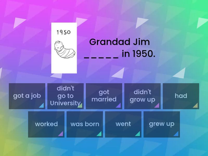 was born - Grandad Jim _____ in 1950., didn't grow up - He _____ in a town or city. (x), grew up - He _____ on a farm., didn't go to University - He _____ when he finished school. (x), got a job - He _____ as a firefighter., got married - He _____ to my grandma in 1974., had - They _____ three children., went - When he was 30 he _____ to University to study Science., worked - Then he _____ as a vet. He loves animals!,