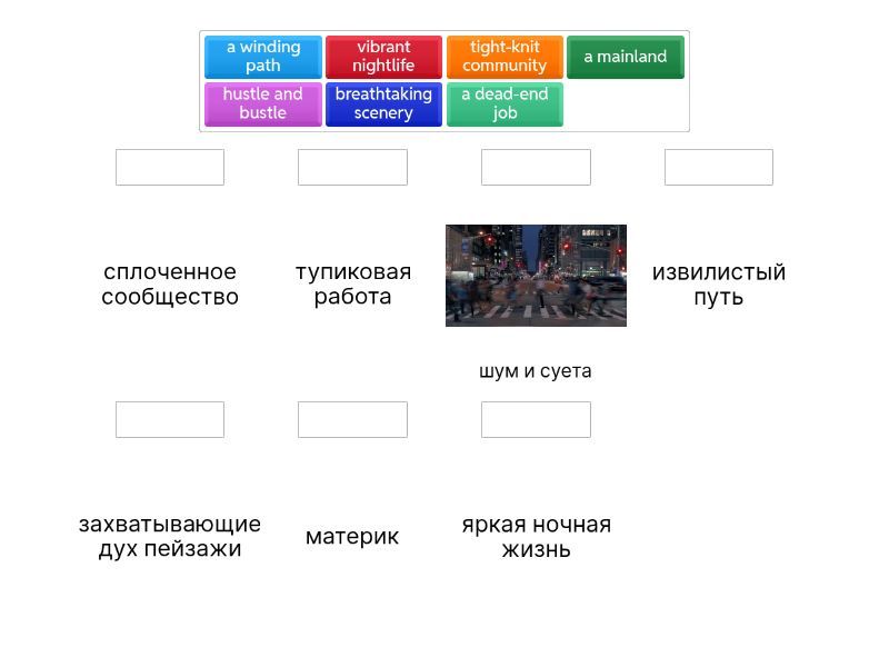 hustle and bustle - шум и суета, vibrant nightlife - яркая ночная жизнь, a dead-end job - тупиковая работа, to lose touch with friends - потерять связь с друзьями, a remote place - отдаленное место, a winding path - извилистый путь, to commute to work - добираться на работу, breathtaking scenery - захватывающие дух пейзажи, the sense of community - чувство общности, an urban life - городская жизнь, picturesque cottage - живописный коттедж, tight-knit community - сплоченное сообщество, a mainland - материк,