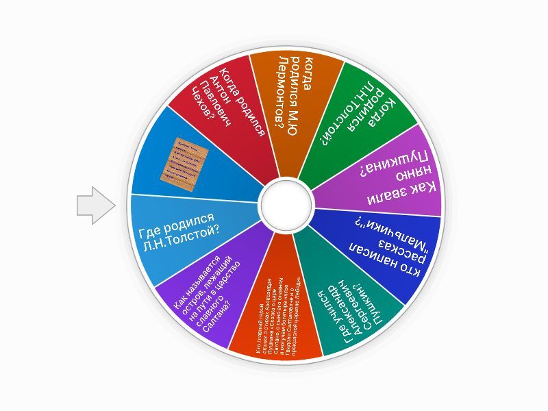 1) Когда родился Антон Павлович Чехов? a) 17 (29) января 1860  b) 19 августа 1865 c) 21 апреля 1850 d) 13 марта 1855 2) когда родился М.Ю Лермонтов? a) 3 (15) октября 1814 b)  4 ноября 1819 c) 30 сентября 1818 d) 21 октября 1818 3) Когда родился Л.Н.Толстой? a) 28 августа (9 сентября) 1828 b) 30 августа 1829 c) 29 сентября 1830 d) 30 июля 1831 4) Как звали няню Пушкина? a) Арина Родионовна b) Екатерина Владимировна c) Александра Владимировна 5) кто написал рассказ "Мальчики''? a) А.П.Чехов b) А.С.Пушкин c) Л.Н.Толстой d) М.Ю.Лермонтов 6) Где учился Александр Сергеевич Пушкин? a) В Императорском Царскосельском лицее b) В обычной школе 7) Кто главный герой сказки в стихах Александра Пушкина «Сказка о царе Салтане, о сыне его славном и могучем богатыре князе Гвидоне Салтановиче и о прекрасной царевне Лебеди» a) Князь Гвидон b) Царь Салтан c) Царица d) Повариха и Ткачиха  8) Как называется остров, лежащий на пути в царство славного Салтана? a) Остров Буян b) Остров Баян c) необитаемый остров  9) Где родился Л.Н.Толстой? a) Ясная Поляна b) Лопатино c) Москва d) Владивосток