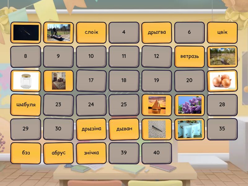 цыбуля, абрус, знічка, цвік, дрызіна, дрыгва, бэз, слоік, ветразь, дыван, гузік, парасон, вясёлка, поўня, рыдлёўка, патэльня, кажан, люстра, кіях, пэндзаль,