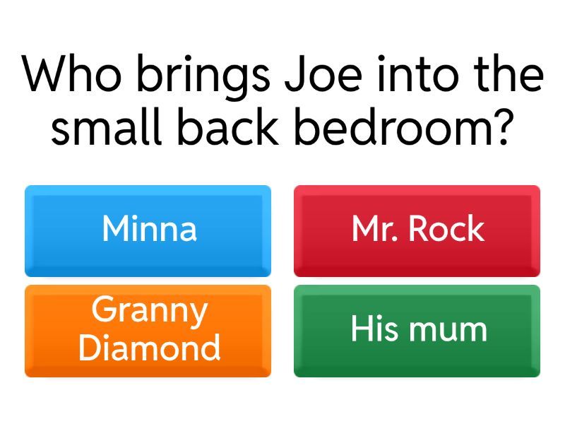 1) Who brings Joe into the small back bedroom? a) Minna b) Mr. Rock c) Granny Diamond d) His mum 2) How does Joe feel when he first enters the room? a) Excited b) Nervous c) His heart sinks d) Sleepy 3) What does Granny Diamond do to show Joe the view? a) Opens the window b) Draws aside the curtains c) Turns on a lamp d) Lifts him up onto a chair 4) What special thing does Granny Diamond show Joe? a) A rainbow b) A river c) The owl-tree d) A mountain 5) What does Joe see through the window? a) A garden full of roses b) A great sweep of leaves changing colour c) A busy street d) Snow falling 6) What colours are the leaves on the owl-tree? a) Blue, silver, and purple b) Red, green, and gold c) Brown, black, and yellow d) White and grey 7) What happens to the leaves when the wind blows? a) They stay completely still b) They turn into seeds c) They fall in bright showers d) They glow in the dark 8) What surprises Joe when he sees the tree? a) It moves on its own b) It is very tall c) There are birds in it d) It has fruit on it 9) Why does Granny say it is called the owl-tree? a) Because she painted an owl on it b) Because an owl used to nest there c) Because it looks like an owl d) Because Joe named it 10) What does Granny say she saw in the tree a long time ago? a) A fox b) A robin c) An owl d) A squirrel 11) What had changed the colour of the leaves? a) Sunlight b) Snow c) Rain d) The winter frost 12) Where did Joe used to live? a) In the countryside b) On a farm c) In a city d) By the seaside 13) What extra feeling does Joe get when he looks at the tree? a) Fear b) Hunger c) A little stab of wonder d) Anger 14) What does Joe ask Granny about the owl-tree? a) When it will be cut down b) Why she likes it c) Why she calls it the owl-tree d) Whether he can climb it
