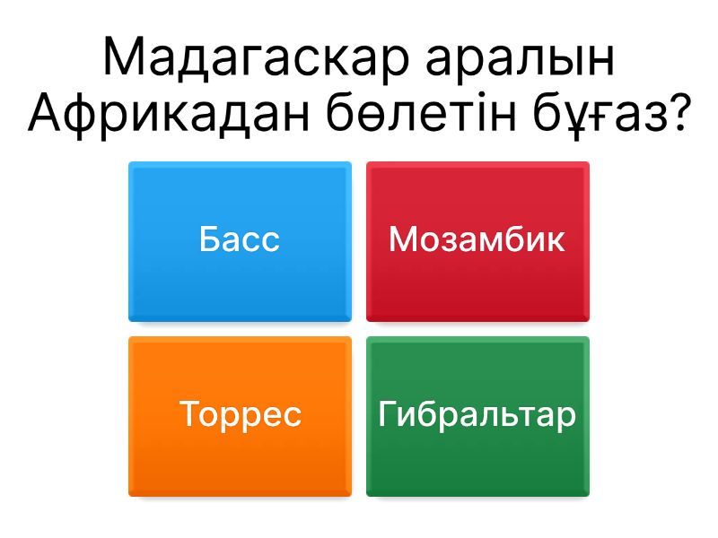 1) Мадагаскар аралын Африкадан бөлетін бұғаз? a) Басс b) Мозамбик c) Торрес d) Гибральтар 2) Үлкен Виктория шөлі қай табиғи аймақта орналасқан? a) Шығыс Аустралия жағалығы b) Кейп-Йорк түбегі c) Орталық Аустралия үстірті d) Кимберли жазығы 3) Нигер өзені қай шығанаққа құяды? a) Аден b) Гудзон c) Сиам d) Гвинея 4) Скандинавия түбегі қай екі теңіздің арасында жатыр? a) Норвег және Балтық b) Баренц және Ақ теңіз c) Солтүстік және Лаптевтер d) Ирланд және Солтүстік 5) Еуразиядағы ең үлкен жазық? a) Үнді–Ганг b) Аляска c) Батыс Сібір жазығы d) Ұлы Қытай жазығы 6) Африкадағы ең биік тау? a) Кап b) Атлас c) Камерун d) Килиманджаро 7) Дүниежүзіндегі ең үлкен шөл? a) Тар b) Сонора c) Такла-Макан d) Сахара 8) Ең көлемді және ең суы мол өзен жүйесі? a) Лена b) Ганг c) Амазонка d) Янцзы 9) Еуразия мен Солтүстік Американы бөлетін бұғаз? a) Магеллан b) Беринг c) Гибралтар d) Дрейк 10) Үнді мұхитының ең үлкен шығанағы? a) Бенгал b) Гудзон c) Мексика d) Калифорния 11) Әлемдегі ең үлкен арал? a) Ванкувер b) Отты жер c) Жаңа-Гвинея d) Гренландия 12) Дүниежүзіндегі ең үлкен түбек атауы? a) Үндістан b) Араб c) Аппенин d) Скандинавия 13) Амазония ойпаты қай материкте орналасқан? a) Оңтүстік Америка b) Африка c) Австралия d) Солтүстік Америка 14) Солтүстік Америка материгінің оңтүстіктен шектесетін мұхит атауы? a) Тынық b) Солтүстік мұзды мұхит c) Атлант d) Үнді 15) Әлемдегі ең үлкен көл қайсысы? a) Женева b) Байкал c) Ладога d) Каспий 16) Дүниежүзіндегі ең терең мұхиттық шұңғыма қайсысы? a) Мариана b) Гренланд теңізі c) Зонд d) Пуэрто-рико 17) Еуразиядағы ең биік тау шыңы? a) Аконкагуа b) Монблан c) Мак-Кинли d) Эверест 18) Ніл өзенінің сағалық жүйесі қай теңізде орналасқан? a) Қызыл теңіз b) Аден шығанағы c) Жерорта теңізі d) Қара теңіз 19) Орта Азиядағы ең үлкен тұзды көл — Арал теңізі қай екі елдің арасында? a) Қазақстан-Тәжікстан b) Қазақстан-Өзбекстан c) Қазақстан-Түркіменстан d) Қахақстан-Қырғызстан 20) Оңтүстік Американың ең ұзын әрі жанартаулы тау жүйесі? a) Анд b) Альпі c) Кордилера d) Айдаһар