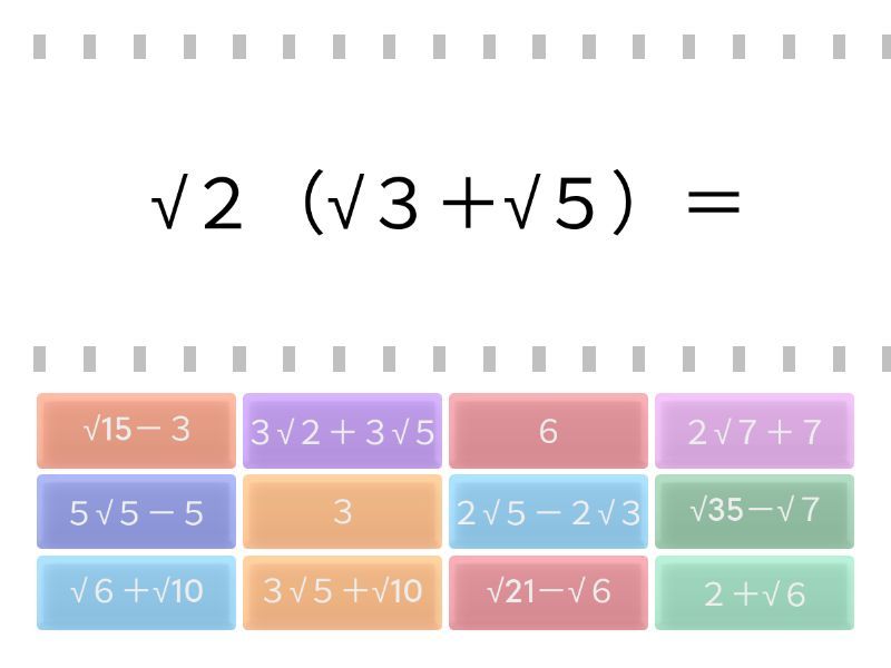 √6+√10 - √2(√3+√5)=, √21-√6 - √3(√7-√2)=, 3√5+√10 - √5(3+√2)=, √35-√7 - √7(√5-1)=, 2√7+7 - √7(2+√7)=, 5√5-5 - √5(5-√5)=, 2+√6 - √2(√2+√3)=, √15-3 - √3(√5-√3)=, 3√2+3√5 - √3(√6+√15)=, 2√5-2√3 - √2(√10-√6)=, 6 - (√8+√2)×√2=, 3 - (√12-√3)×√3=,