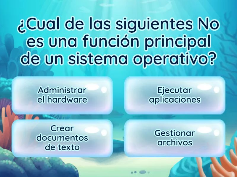 1) ¿Cual de las siguientes No es una función principal de un sistema operativo? a) Administrar el hardware b) Ejecutar aplicaciones c) Crear documentos de texto d) Gestionar archivos  2) ¿Que tipo de software actúa como intermediario entre el usuario y el hardware de la computadora? a) Aplicación b) Sistema operativo c) Controlador (driver) d) Firmware  3) ¿Cual es el propósito del “Administrador de tareas” en windows o monitor de actividad en macOS ? a) Cambiar el fondo de pantallas b) Desinstalar programas c) Ajustar el volumen del sonido d) Monitorear el rendimiento del sistema y cerrar aplicaciones 4) ¿Que es un “driver” o controlador a) Un programa para diseñar gráficos b) Un software que permite al sistema operativo comunicarse con un dispositivo de hardware c) Un dispositivo de almacenamiento externo d) Una herramienta para limpiar el registro del sistema 5) ¿Cual de las siguientes opciones describe mejor la función de la “ papelera de reciclaje”  a) Almacena temporalmente archivos b) Elimina archivos de forma permanente c) Optimiza el rendimiento del disco duro d) Protege contra el virus 6) ¿Que significa el término “multitarea” en un sistema operativo? a) La capacidad de ejecutar solo un programa ala vez b) La capacidad de ejecutar múltiples programas simultáneamente c) La capacidad de conectarse a múltiples redes Wi-Fi d) La capacidad de crear múltiples cuentas de usuario 7) ¿Donde puedes cambiar la configuración de idioma en la mayoría de sistemas operativos? a) En el navegador web b) En la tienda de aplicaciones c) En el panel de control o configuración del sistema d) Nose puede cambiar el idioma 8) ¿Que es una actualización del sistema operativo? a) Un programa nuevo que reemplaza al sistema operativo anterior b) Un juego c) Un tipo de virus d) Una mejora o corrección que se instala en el sistema operativo existente 9) ¿Cual es la función del “ firewall” o cortafuegos ? a) Proteger el sistema contra accesos no autorizados desde la red b) Acelerar la conexión a internet c) Organizar los archivos en carpetas d) Cambiar el tema visual del sistema operativo 10) ¿Que es una cuenta de usuario en un sistema operativo? a) Una cuenta bancaria b) Una cuenta en redes sociales c) Un perfil que permite a diferentes personas usar la misma computadora con configuraciónes y archivos separados d) Un programa para crear presentaciones