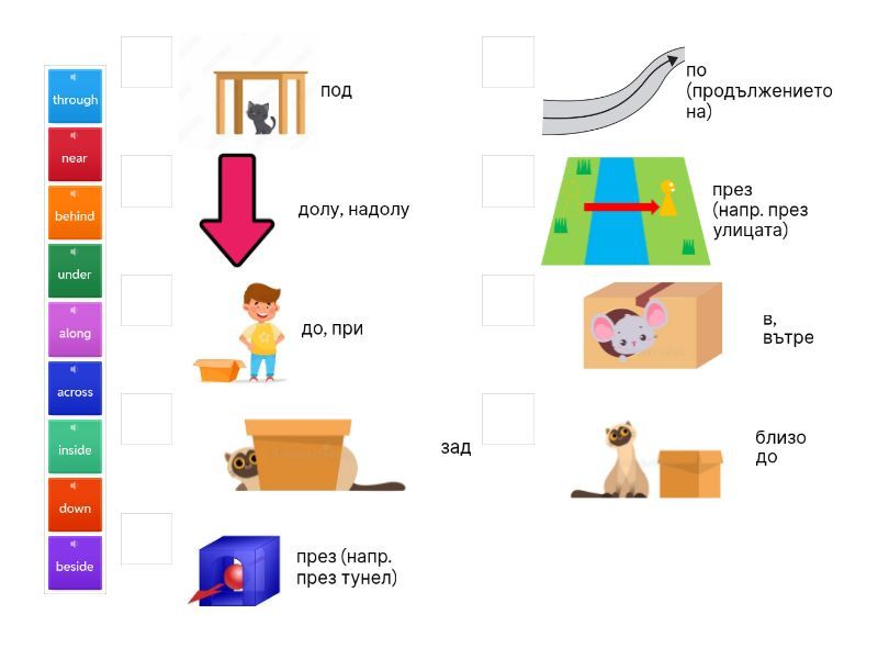 across - през (напр. през улицата), along - по (продължението на), behind - зад, beside - до, при, down - долу, надолу, inside - в, вътре, near - близо до, through - през (напр. през тунел), under - под,