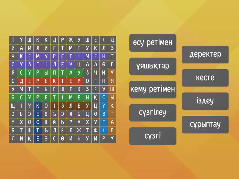 сұрыптау - сұрыптау, сүзгілеу - сүзгілеу, деректер - деректер, сүзгі  - сүзгі, іздеу - іздеу, кесте - кесте, ұяшықтар - ұяшықтар, өсу ретімен - өсу ретімен, кему ретімен - кему ретімен,