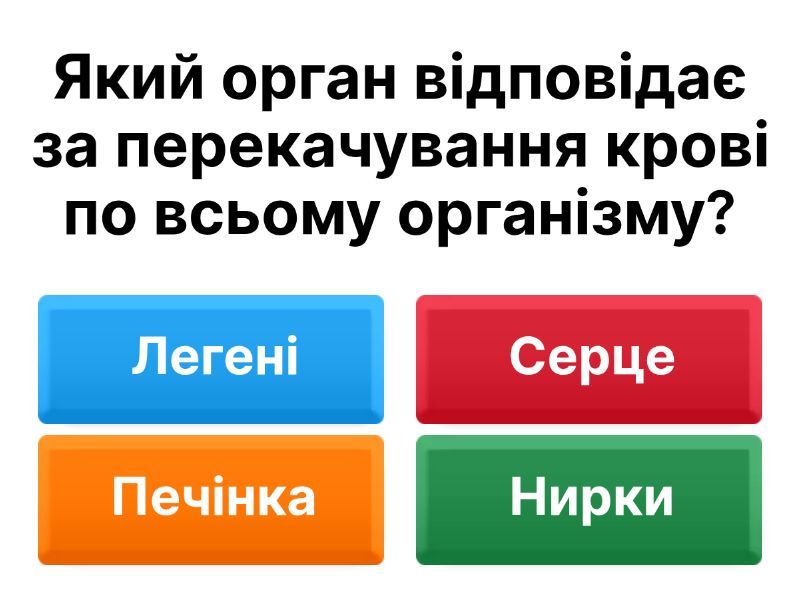 1) Який орган відповідає за перекачування крові по всьому організму? a) Легені b) Серце c) Печінка d) Нирки 2) Де в організмі людини відбувається основне всмоктування поживних речовин? a) Шлунок b) Товстий кишечник c) Тонкий кишечник d) Підшлункова залоза 3) Яка частина нервової системи контролює свідомі рухи тіла? a) Симпатична нервова система b) Центральна нервова система c) Парасимпатична нервова система d) Ендокринна система 4) Яка кістка є найдовшою в тілі людини? a) Плечова кістка b) Ліктьова кістка c) Стегнова кістка d) Великогомілкова кістка 5) Як називається частина ока, що відповідає за сприйняття світла? a) Кришталик b) Рогівка c) Зіниця d) Сітківка 6) Який орган виробляє інсулін? a) Селезінка b) Підшлункова залоза c) Жовчний міхур d) Печінка 7) Яка група м’язів відповідає за рухи грудної клітки під час дихання? a) Сідничні м’язи b) М’язи преса c) Міжреберні м’язи d) Дельтоподібні