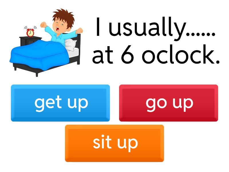 1) I usually...... at 6 oclock. a) get up b) go up c) sit up 2) Then I ...... . a) get a shower b) get dressed c) go school 3) I ........breakfast. a) leave b) got c) have 4) Then I .........my teeth. a) wash b) brush c) cleaned 5) Then I ...........to school. a) go b) went c) going 6) I ........ and ......... at school. a) study/ play b) eat/ sleep c) go/ play 7) I.........lunch at school. a) has b) have c) eating 8) I ........home on the school bus. a) play b) go c) listen 9) I .......my homework at 4:00 o'clock. a) study b) do c) play 10) I ....... the net after doing my homework. a) use b) play c) surf 11) I .......in the park at 5.00 o'clock. a) go b) play c) going 12) I .........dinner at 6.00 o'clock. a) have b) ate c) has 13) I .........a shower at 7.00 o'clock. a) go b) have c) swim 14) I .......TV at 8.00 o'clock. a) see b) watch c) go 15) I ........to bed at 9.00 o'clock. a) have b) go c) sleep