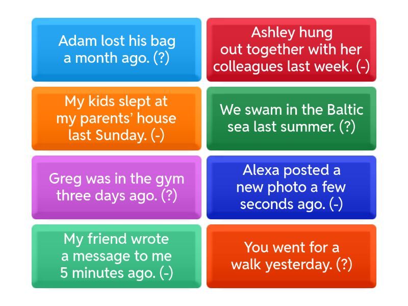 You went for a walk yesterday. (?) - Did you go for a walk yesterday?, My friend wrote a message to me 5 minutes ago. (-) - My friend didn't write a message to me 5 minutes ago., Greg was in the gym three days ago. (?) - Was Greg in the gym three days ago?, Ashley hung out together with her colleagues last week. (-) - Ashley didn't hang out together with her colleagues last week., Adam lost his bag a month ago. (?) - Did Adam lose his bag a month ago?, We swam in the Baltic sea last summer. (?) - Did we swim in the Baltic sea last summer?, My kids slept at my parents’ house last Sunday. (-) - My kids didn't sleep at my parents’ house last Sunday., Alexa posted a new photo a few seconds ago. (-) - Alexa didn't post a new photo a few seconds ago.,