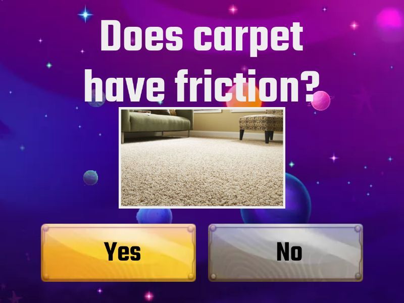 1) Does carpet have friction? a) Yes b) No 2) Does a slide at the park have friction? a) Yes b) No 3) _______________ is a pulling force that pulls objects toward its center. a) gravity b) friction 4) Does the image show an example of gravity? a) Yes b) No 5) Does a balling falling to the ground show an example of gravity?  a) yes b) no
