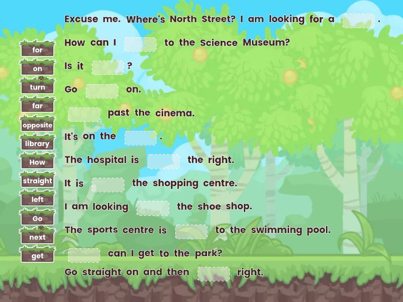 Excuse me. Where's North Street? I am looking for a ____. How can I ____ to the Science Museum? Is it ____? Go ____ on. ____ past the cinema. It's on the ____. The hospital is ____ the right. It is ____ the shopping centre. I am looking ____ the shoe shop. The sports centre is ____ to the swimming pool. ____ can I get to the park? Go straight on and then ____ right.
