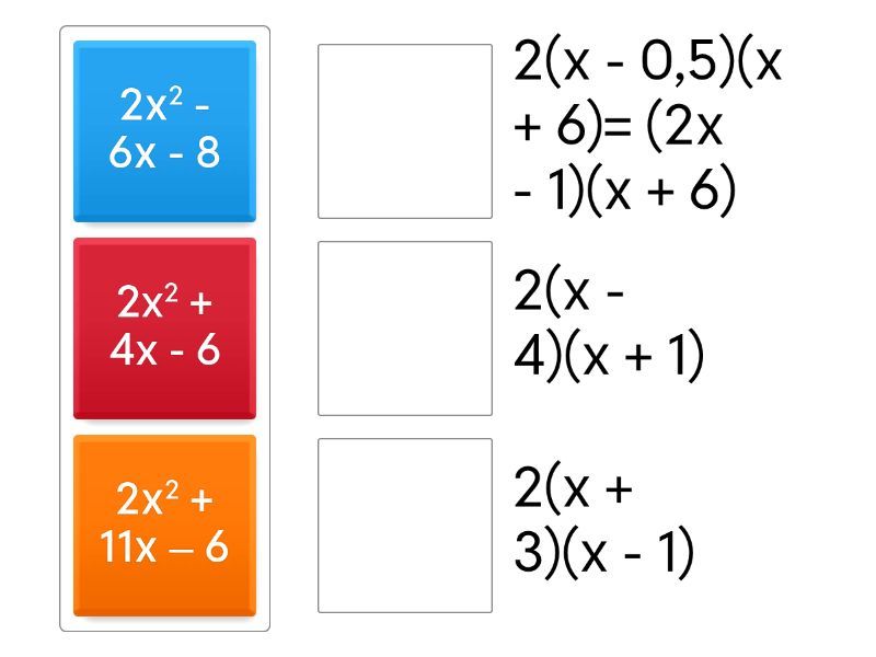 2x2 + 4x - 6  - 2(х + 3)(х - 1), 2х2 - 6х - 8 - 2(х - 4)(х + 1), 2х2 + 11х – 6 - 2(х - 0,5)(х + 6)= (2х - 1)(х + 6),