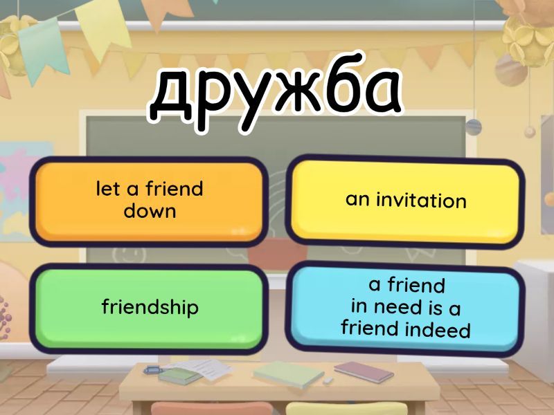 1) дружба a) let a friend down b) an invitation c) friendship d) a friend in need is a friend indeed 2) співрозмовник a) a companion  b) a wedding reception c) pretend prɪˈtend d) share feelings / background 3) ставати друзями a) make friends b) niece niːs c) invite guests d) a bride 4) розділяти почуття/минуле a) make friends b) share feelings / background c) rely on a friend d) a companion kəmˈpænjən 5) зовнішність a) pretend prɪˈtend b) keep in touch c) niece niːs d) appearance 6) протилежності притягуються a) a groom b) opposites attract c) be in trouble d) appearance əˈpɪərəns 7) знайомий a) rely on a friend b) let a friend down c) acquaintance d) the best man 8) покладатися на друга a) appearance əˈpɪərəns b) share feelings / background c) rely on a friend d) turn your back on … 9) залишатися на зв’язку a) newlyweds ˈnjuːlɪˌwed b) keep in touch c) a friend in need is a friend indeed d) be in trouble 10) друг пізнається у біді a) get married b) a groom c) a friend in need is a friend indeed d) pretend prɪˈtend 11) мати проблеми a) get married b) share feelings / background c) make friends d) be in trouble 12) підводити друга a) keep in touch b) acquaintance əˈkweɪntəns c) let a friend down d) make friends 13) прикидатися a) a bride b) pretend prɪˈtend c) let a friend down d) keep in touch 14) гарно ладити a) get on well  b) a groom c) make friends d) nephew ˈnefjuː 15) відвернутися від … a) turn your back on … b) newlyweds ˈnjuːlɪˌwed c) let a friend down d) acquaintance əˈkweɪntəns 16) одружуватися a) be in trouble b) invite guests c) get married d) get on well  17) запрошувати гостей a) invite guests b) a wedding reception c) share feelings / background d) a bride 18) запрошення a) exchange rings b) be in trouble c) an invitation d) nephew ˈnefjuː 19) наречена a) get on well  b) exchange rings c) a bride d) appearance əˈpɪərəns 20) наречений a) let a friend down b) nephew ˈnefjuː c) a bride d) a groom 21) обмінюватися обручками a) a companion kəmˈpænjən b) nephew ˈnefjuː c) get married d) exchange rings 22) молодята a) a wedding reception b) share feelings / background c) newlyweds ˈnjuːlɪˌwed d) be in trouble 23) весільний прийом a) give a speech b) get on well  c) let a friend down d) a wedding reception 24) свідок a) acquaintance əˈkweɪntəns b) the best man c) get on well  d) a groom 25) виголошувати промову a) keep in touch b) give a speech c) share feelings / background d) an invitation 26) племінник a) nephew ˈnefjuː b) exchange rings c) appearance əˈpɪərəns d) a friend in need is a friend indeed 27) племінниця a) get married b) niece niːs c) opposites attract d) a companion kəmˈpænjən